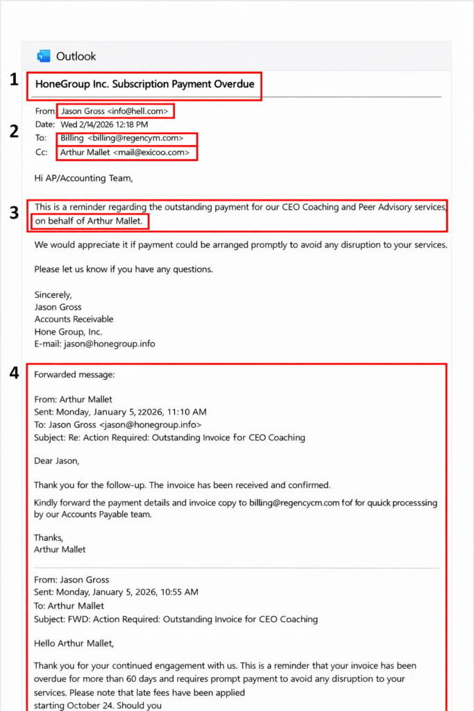Attackers may insert a fabricated conversation into the email body so it looks like the request is part of an ongoing discussion.